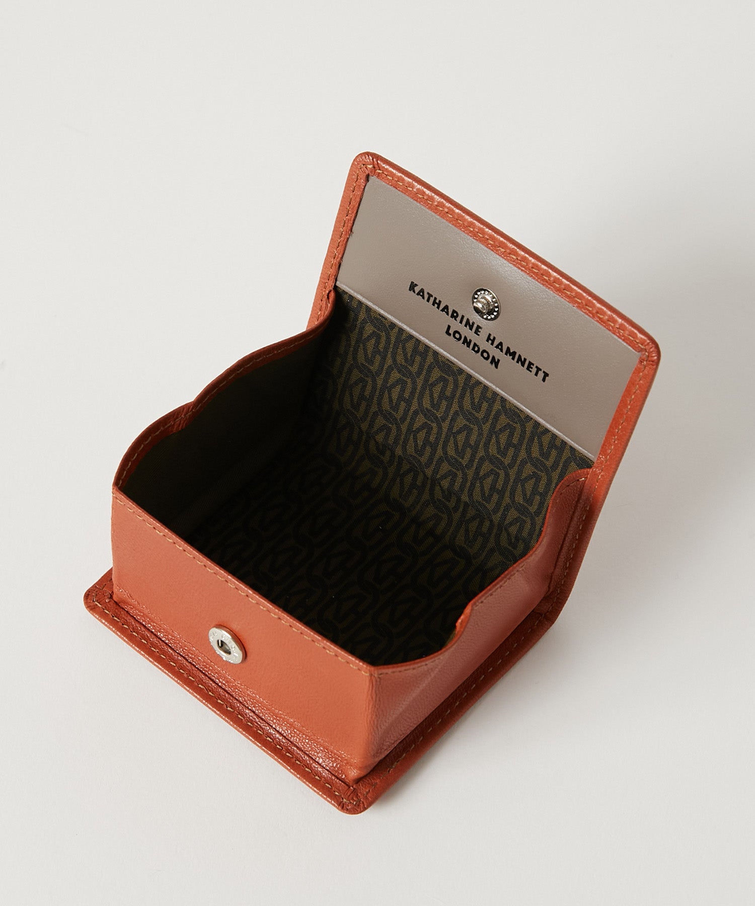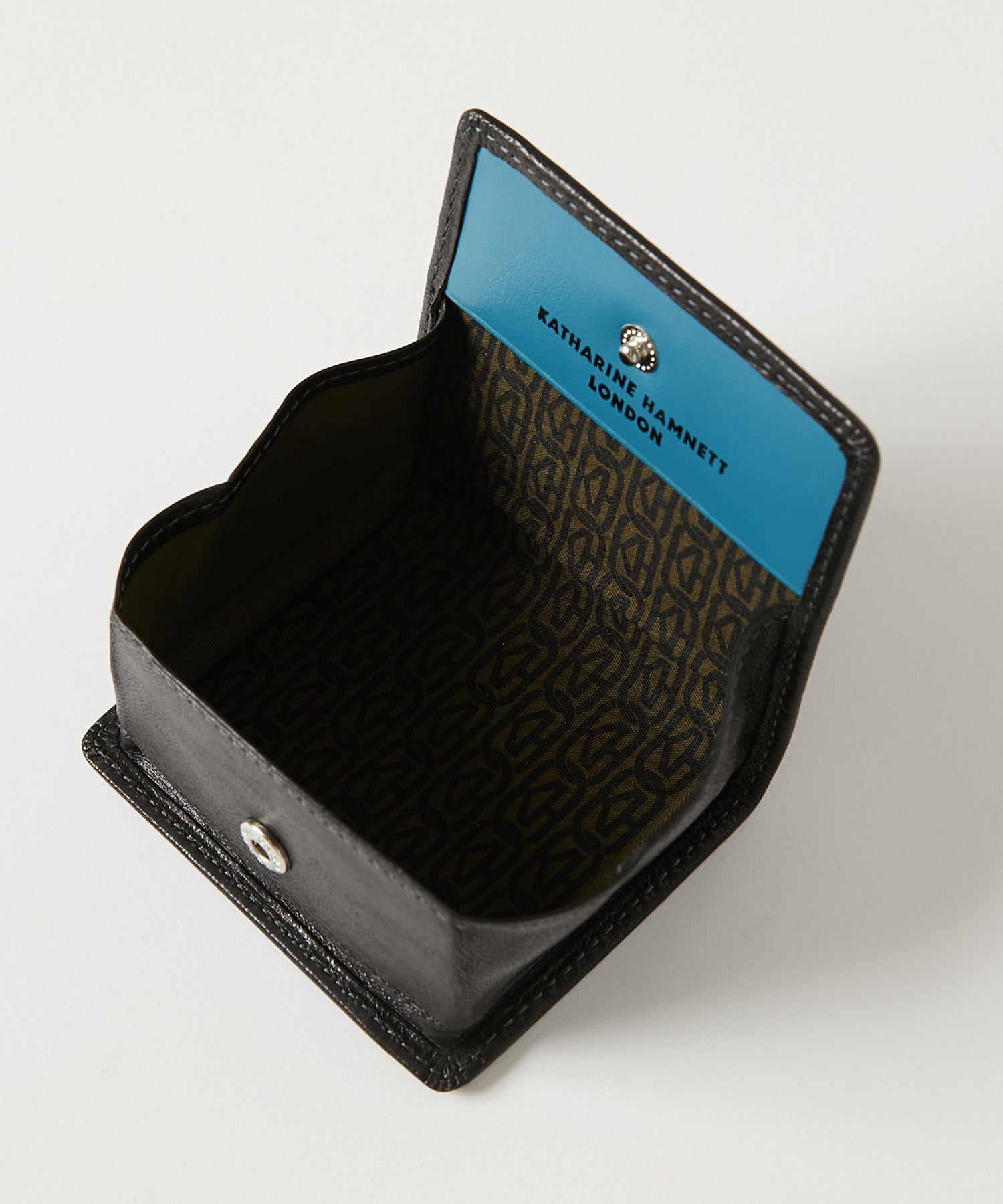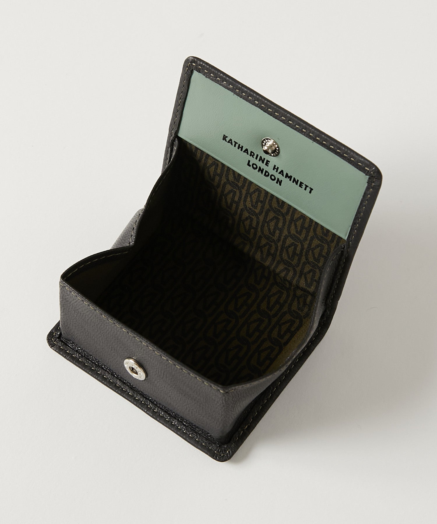 ボックス型の構造により、スナップボタンを開くと中身が一目で確認でき、小銭の出し入れもスムーズ。